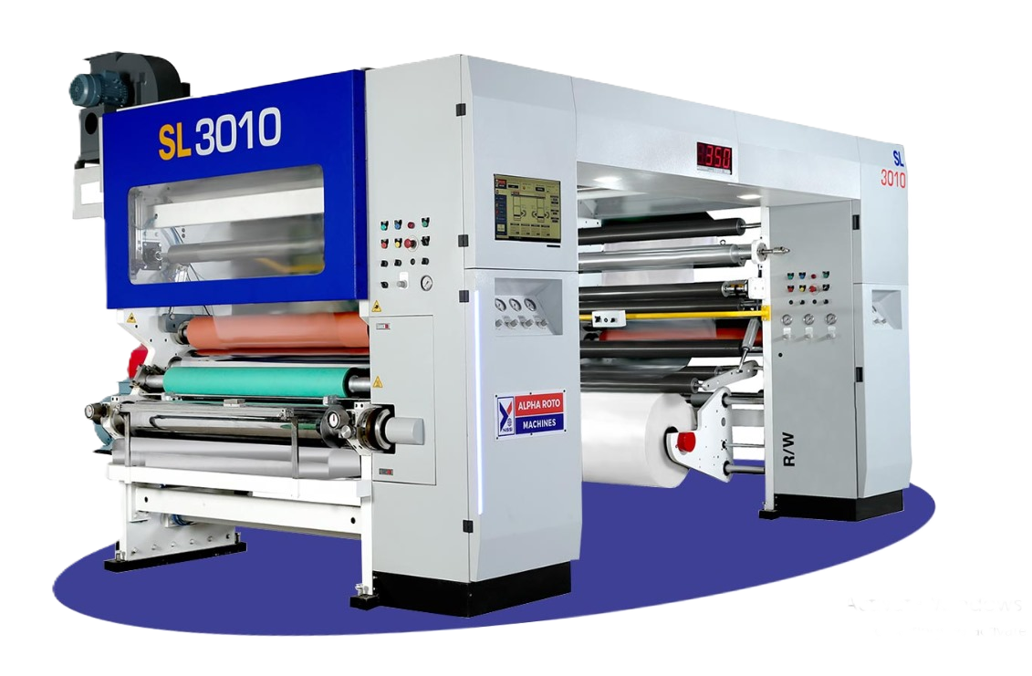 The product shown in the image is the NISSI SL 3010 solventless lamination machine. It is manufactured by Alpha Roto Machines Pvt. Ltd. This machine is designed for solventless lamination on flexible packaging materials. It is suitable for short and medium-run applications.